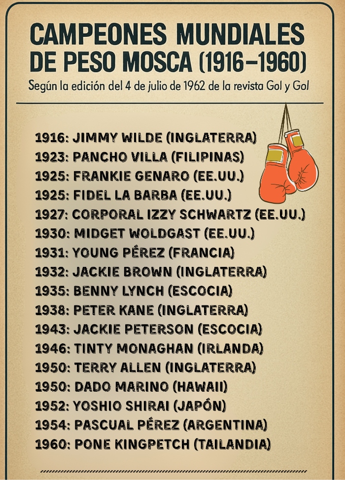 En su edición del 4 de julio de 1962, la histórica revista chilena Gol y Gol -una biblia deportiva de generaciones enteras- dedicó una de sus páginas más vibrantes a la categoría de peso mosca, trazando un recorrido épico que iba desde el mítico Jimmy Wilde hasta el entonces reinante Pone Kingpetch. Hoy, más de seis décadas después, el artículo emerge como una cápsula del tiempo: basta leerlo para sentir el ambiente del gimnasio, escuchar el eco seco de los guantes golpeando las peras y respirar el aire impetuoso de un boxeo que, en esos años, era “pasión de multitudes”.