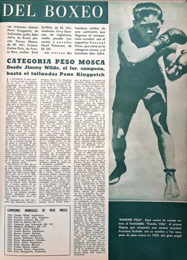 Al final del artículo, la revista despliega un listado que hoy es un tesoro: los campeones mundiales desde 1916 hasta 1960, una verdadera cartografía del boxeo pequeño pero inmenso. Lo acompaña la foto de un Pancho Villa en guardia, captado en pleno esplendor, como si invitara al lector de 1962 -y al de hoy- a subir al ring para sentir el corazón de una época irrepetible.